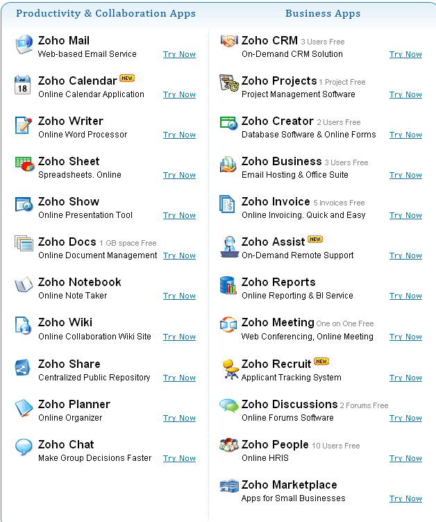 Zoho aslında Google dokümanlardan çok çok daha kapsamlı bir site, aklınıza gelmeyecek bir sürü hizmet tek çatı altında toplamayı başarmışlar. Hindistan merkezli bu site zaten bu özelliği ile Google’ı oldukça kıskandırıyor. Zoho‘nun aşağıdaki resimden de anlaşılacağı üzere asıl hedefi ticari kullanıcılar, ama neredeyse tüm hizmetlerinin bedava sürümleri de bulunmakta.