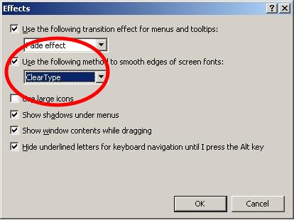 Clear Type’ı etkin hale getirmek aslında oldukça kolay. Masaüstünde sağ tıklayarak: özellikler (ayarlar)’a tıklayarak monitör ayarlarınıza gelin. Daha sonra efektler seçeneklerine girip, Clear Type’ı etkin hale getirin. Sistem fontlarındaki değişikliği hemen farkedeceksiniz.