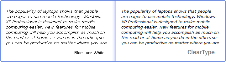 Eğer Windows XP veye Vista kullanıyorsanız okuma kolaylığı sağlayacak başka bir özellik de ‘Clear Type’ efektini etkin hale getirmektir. (Windows 7, Ubuntu ve Mac’te zaten olan bir özellik). Bu ne demek ki diyorsanız, aşağıdaki resimde karşılaştırmalarını bulabilirsiniz.