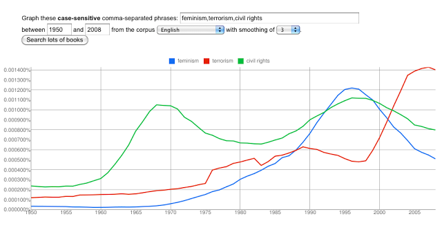 Ya da feminizm, insan hakları, terörizm gibi kavramların kitaplardaki etkinliğinin nasıl değiştiğini incelemek isterseniz, aşağıdaki gibi bir durum çıkıyor. Terörizm korkusu 1995’ten sonra (ama 11 eylül’den de önce) pompalanmaya başlanıyor ve hala bir artış içinde, terörizm deki artışla aynı anda insan hakları kavramları da ciddi bir düşüşe geçiyor.