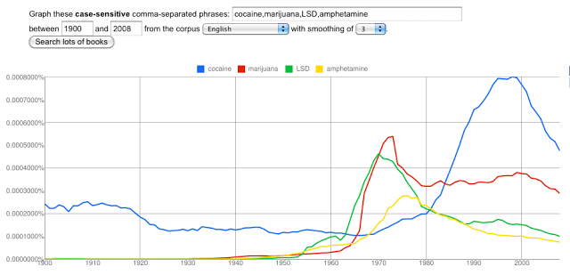 Ya da mesela dünyadaki uyuşturucu kullanımı (en azından kitaplara yansıması) hakkında da bir bilgi edinebilirsiniz. 1970’lerde LSD, esrar gibi uyuşturucular revaçtayken, 80 döneminde bir kokain patlaması yaşanmış. Ama 2000’den sonra hepsi düşüşe geçmiş. Tabi kitaplarda geçen kelime sıklığıyla, gerçek uyuşturucu tüketimi arasındaki ilişki ne kadar doğrudur bilemeyeceğim.