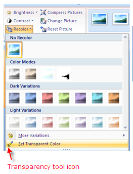 - Office 2007, resimi seçtikten sonra Biçimlendir(format) tabından, Recolor (?) seçeneğinden gene aynı simgeyi bulup, arkaplan rengini kaldırabilirsiniz.
