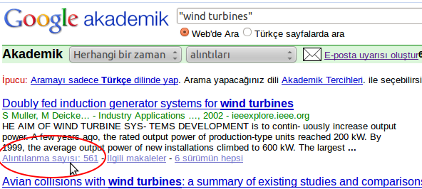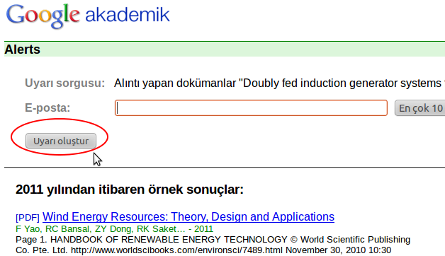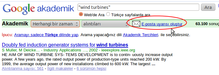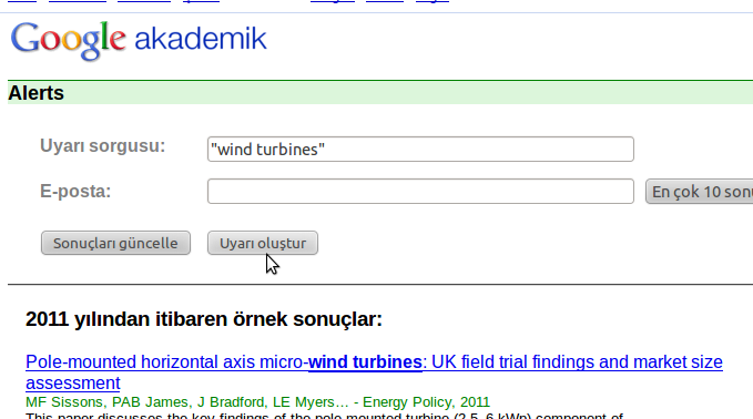 Google Alerts’in mantığı şu şekilde, diyelim ki rüzgar türbinleri ile ilgili makalelerle ilgileniyorsunuz ve bu konuyla ilgili çıkan tüm yeni yayınlardan haberdar olmak istiyorsunuz. Önce bu konuyu Google Akademik’de aratın.Daha sonra sağ taraftaki ‘E-posta uyarısı oluştur’ linkine tıklayarak maille hatırlatma oluşturabilirsiniz.