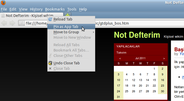 Evet dosyanızı indirdiniz, bilgisayarınıza kaydettiniz. Artık eklemek istediğiniz notları ekleyebilirsiniz. Yalnız tüm eklemek istediklerinizi bir anda eklemeye çalışmayın. Yavaş yavaş aklınıza birşeyler geldikçe not alın. Ama eğer TiddlyWiki’de karar kıldıysanız da sadık kalın. Zaman geçtikçe sizin de her aradığınızı kolayca bulabileceğiniz, tonlarca notu tasnifleyebileceğiniz bir wikiniz oluşacaktır. Hoşuma giden başka bir özelliği ise html kodu gömmenize de izin vermesi. Bu sayede, Google Takvim’inizi yapıştırabilir, randevularınızı tek sayfadan görebilirsiniz. Ya da ne bileyim YouTube’dan hoşunuza giden bir videoyu bile TiddlyWiki içine yerleştirebilirsiniz. Dosyanıza kolayca erişmek için Firefox’da Application tab olarak ekleyebilirsiniz. Bu sayede internet tarayıcınızı her açtığınızda wikiniz elinizin altında olacak.