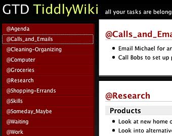 - GtdTiddlyWiki:Bu da benim kullandığım şablon. Ancak orjinal linkteki şablon biraz fazla tefferruatlı. Daha boş ve Türkçe birkaç yardım sayfası eklediğim versiyonu şu linkden(sağ tıklayarak) indirebilirsiniz.
