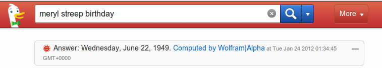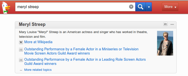 DuckDuckGo bazen bulabildiği bilgileri doğrudan Wikipedia’dan ya da Wolfram Alpha‘dan çekiyor. Böylelikle aradığınız cevabı doğrudan arama sayfasında bulabiliyorsunuz. Mesela Meryl Streep diye aradığınız zaman aşağıdaki gibi bir sayfa görüyorsunuz.