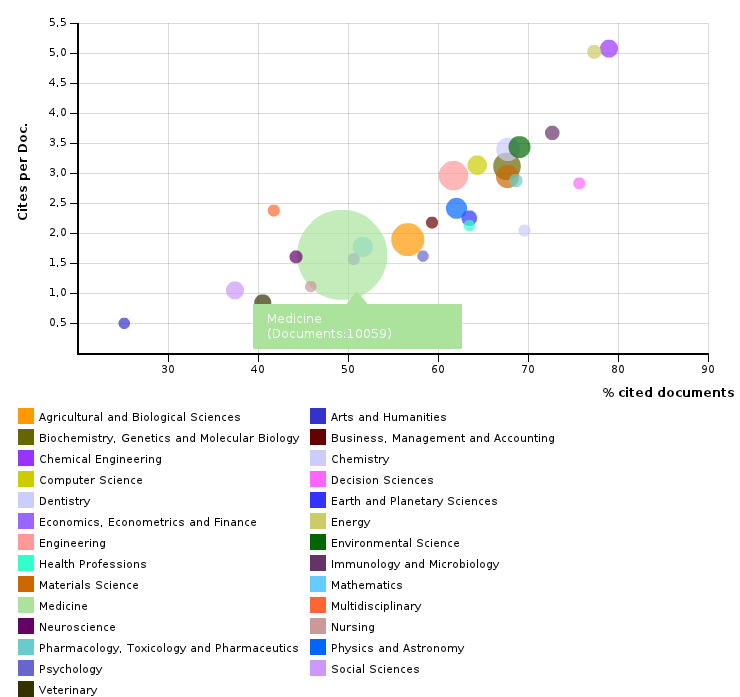 Uzun lafın kısası, çok makale yazıyoruz ama makalelerimizi kimse okumuyor, atıf yapmıyor. Türkiye’deki değişik bilim dallarında yayınlanan makale sayılarını ve atıf oranlarını karşılaştırırsak da aşağıdaki gibi bir tablo çıkıyor. Bu grafikte dikey eksen makale başına alınan ortalama atıf sayısı, yatay eksen ise bir makalenin atıf alma oranı. Dairelerin boyutu ise o alanda yayınlanan makale sayısıyla orantılı. Grafiğin sağ üst tarafındaki daire Kimya Mühendisliği. Kimya Mühendisliği alanında yayınlanan makaleler ortalama 5 atıf almış. Grafikte aşağı doğru inildikçe işler kötüleşiyor. En büyük daire, tıp alanındaki makaleleri gösteriyor. Tıp alanında diğer alanlarda çok daha fazla makale yayınlanmasına rağmen atıf alma oranı %50 bile değil. Yani yayınlanan her iki makaleden biri başka hiçbir bilim-insanının işine yaramadan tarihin tozlu sayfalarındaki yerini alıyor.