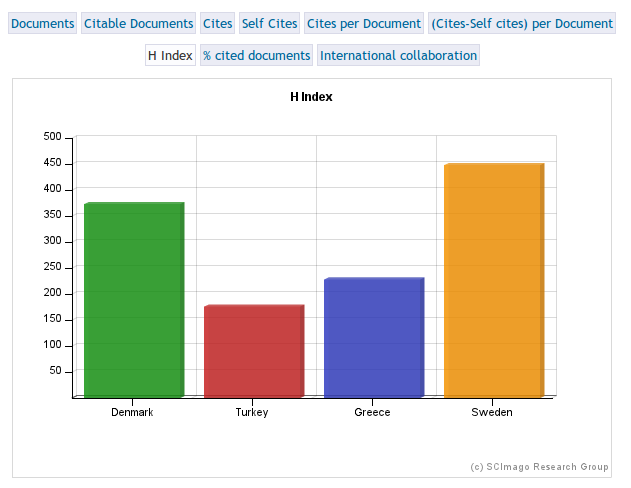 Görüldüğü gibi Türkiye son yıllarda makale sayısında oldukça hızlı bir yükselişte. 2001 yılında Danimarka’yı, 2008 yılında ise İsveç’i geçmişiz. Siteye göre Türkiye’de yılda 30.000 makale yayınlanıyor. Bu sayılar Türkiye’nin bilimsel gelişmesini gösteren sayılar olarak kullanılabilir pekala. Şimdi bir de bu makalelerin h-index değerlerine bakalım.