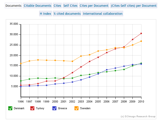 Bu siteyi kullanarak Türkiye için birkaç grafik hazırladım. İlk önce makale sayılarına bakalım. Ülkelerimiz Danimarka, İsveç ve Yunanistan olsun.