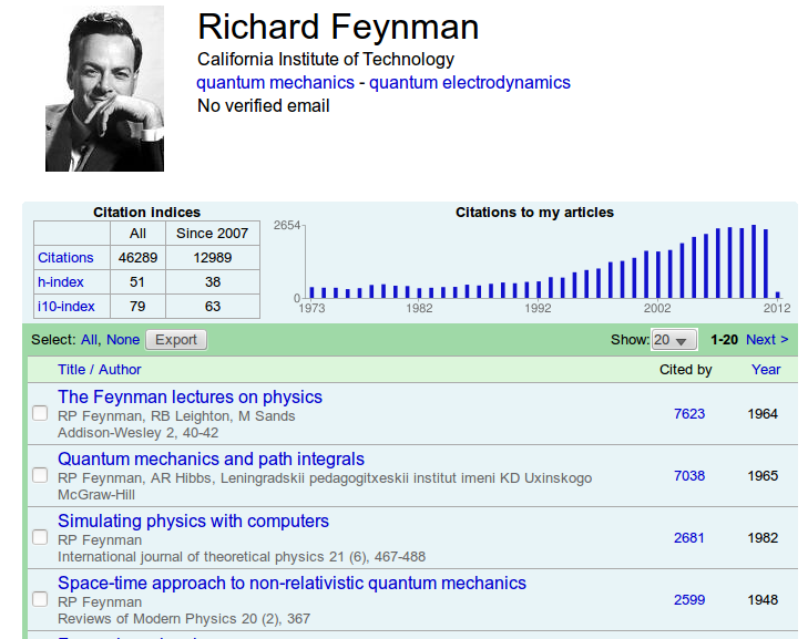 adresine gitmeniz yeterli. Peki bu profilin size ne faydası olacak? Öncelikle yayınlarınızı listelediğiniz bir web siteniz yoksa, yayınlarınızı ve yayınlarınıza yapılan referansları otomatik olarak listeyebilirsiniz. Ya da başka yazarların sayfasını araştırıp, o yazarın tüm makalelerini görebilir, yeni yayınlarından RSS ile haberdar olabilirsiniz. Mesela, Richard Feynman‘ın Google Akademik sayfası aşağıdaki gibi: