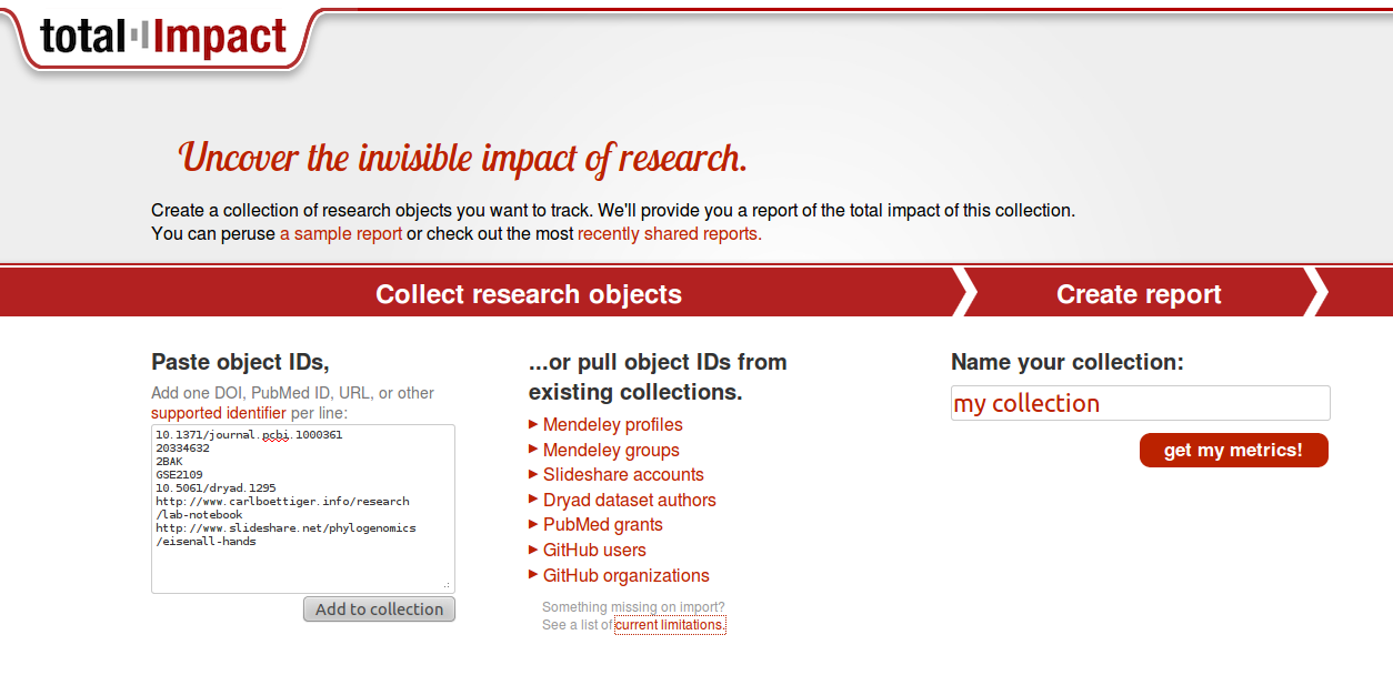 Total impact ise daha farklı bir yol izliyor. Sadece makale sayınızı ve atıflarınızı listelemek yerine. Farklı internet hesablarınızın etkisini de görebiliyorsunuz. Mesela SlideShare‘a koyduğunuz sumunları ya da GitHub projelerinde yaptığınız katkıları da görebiliyorsunuz.