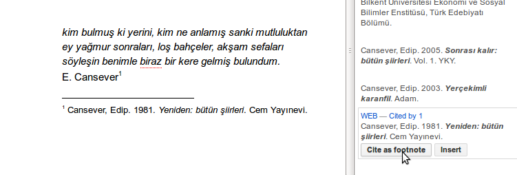Sağ tarafta açılan pencereden aramayı yapabilir, kaynağın linkini ya da referans olarak doğrudan ekleyebilirsiniz. Üstelik sadece Google Akademik değil, başka web sitelerine, resimlerinize de alıntıları doğrudan burdan halledebilirsiniz.