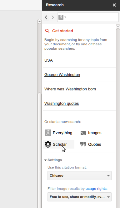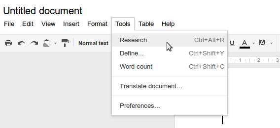 Google Akademik ile Google Docs‘u eşleştirip atıflarınızı kolayca yapabilirsiniz. Bunun için Araçlar -> Araştırma (Tools -> Research) seçeneğine tıklayın. Kısayolu da Ctrl + Alt + R