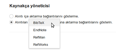 Eğer Bibtex dışında başka bir format kullanmak isterseniz, ayarlar kısmında EndNote, RefWorks gibi seçenekler mevcut. Mendeley kullanıcıları ise tek tıkla dokümanları kütüphanelerine ekleyebilir.