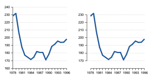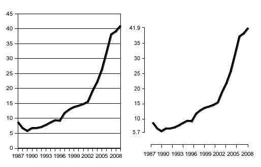 Ancak bu durumlarda dikey ve yatay eksenleri kesiştirmemek ve eksenin aralığının vurgulamak okuyucunun yanılmasını önleyecektir.