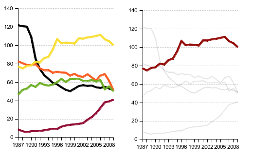Grafik göstergesini grafiğin altına ya da üstüne koymak hem her veriyi ayrı renklerde çizme zorunluluğu doğurur hem de okuyucu bu renkleri grafik göstergesinde tek tek eşleştimek için uğraşır. Üstelik siyah beyaz baskılarda bu iş daha da zorlaşır. En güzeli, grafik etiketlerini doğrudan verilerin yanına eklemektir.