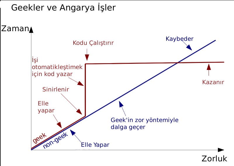 R programını güzel grafikler çizmek için kullanabilirsiniz. Ancak R’ı bir grafik çizme aracına indirmek büyük haksızlık olur. R aslında bir data toplama ve işleme programı. Hemen hemen her iş için geliştirilmiş yüzlerce eklentisiyle eminim sizin de işinize yarayacak bir özelliği vardır. İlk başta R zor gelebilir. R’ı öğrenmekle geçireceğiniz sürede aynı grafikleri Excel’de yapabilir, günü kurtarabilirsiniz. Açıkcası R öğrenmek (ya da linux, latex vb öğrenmek) biraz aşağıdaki karikatürdeki gibi . İlk başta kaybettiğinizi düşündüğünüz zamanları uzun vadede kazanacağınızdan emin olabilirsiniz.
