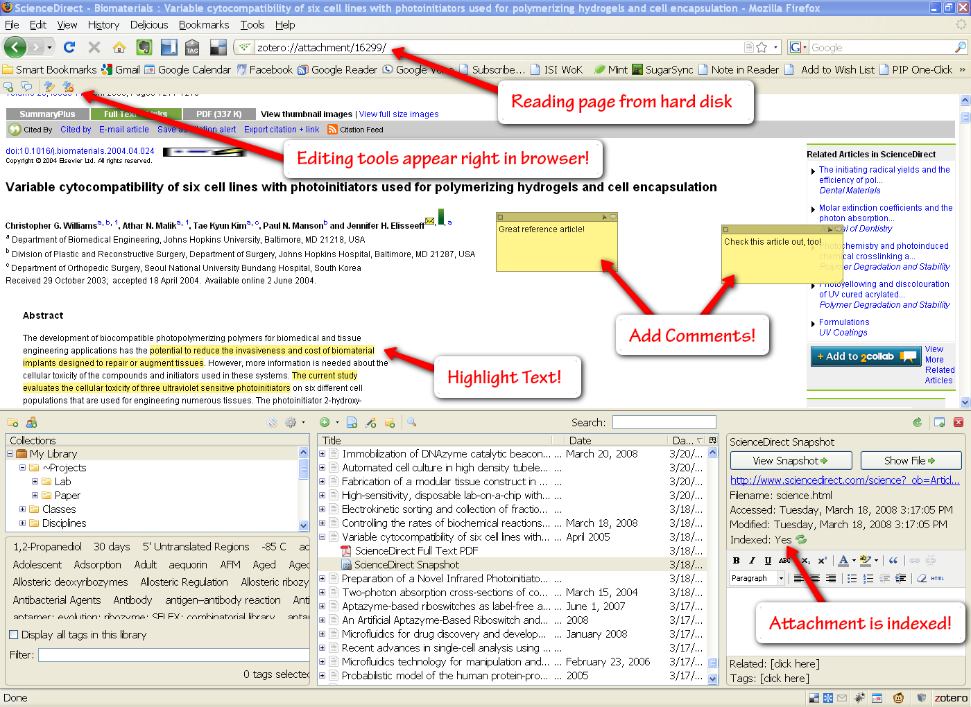Zotero Mendeley’le boy ölçüşebilecek üstelik açık kaynak kodlu oldukça güzel bir program. Şimdiye kadar blogda Zotero hakkında yazı yazmamış olmak da benim ayıbım olsun. Zotero’yu en son Firefox eklentisiyken kullanmıştım, ama artık birçok ekstra özelliğiyle ayrı bir program olarak da kullanmak mümkün. CiteULike’in makale arama ve paylaşma kolaylığı Zotero’da da var, Üstelik Mendeley’deki gibi pdf üstünde notlar alabilirsiniz. Microsoft Word, Open Office, bibtex , xml eklentileri mevcut. Üstelik alıntılarınızı Google dokümanlarınıza yada e-maillerinize de kolaylıkla koyabilirsiniz.